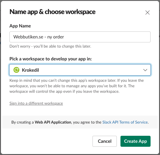 - Ange ett namn på appen samt vilken workspace appen ska höra till.