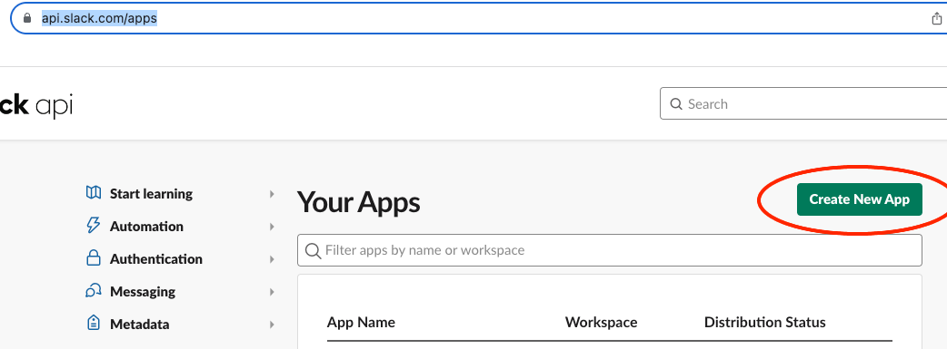 - När du är inloggad på ditt konto i Slack navigerar du till https://api.slack.com/apps.